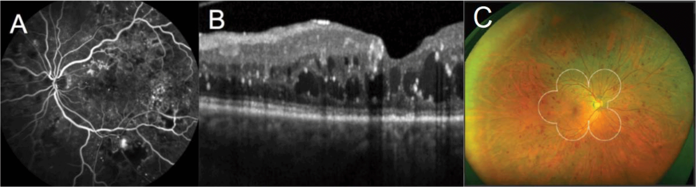 Representative images of the retina taken using (A) fluorescein angiography10, optical coherence tomography10 (B), and ultra-wide field color fundus photography11 (C; white circles show extent of standard field).